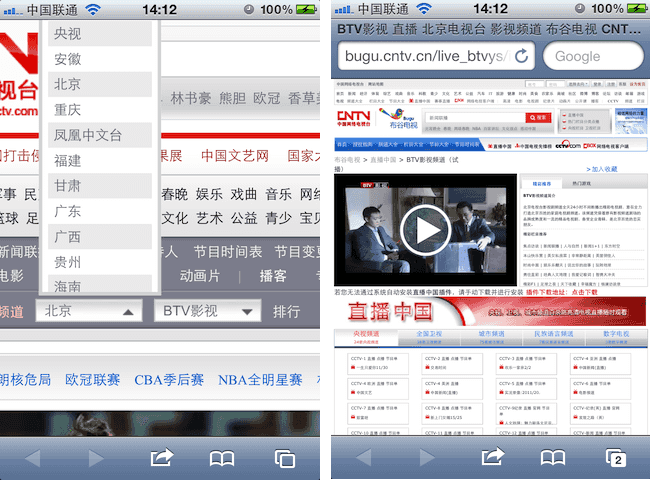 用 iOS 自带的 Safari 浏览器访问 www.cntv.cn,两指张开放大网页,在顶部可以看到电视台选择菜单:左边选择省份,右侧选择具体电视频道