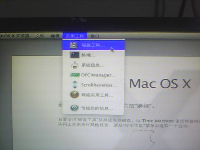 4.进入安装画面,看到上面有一行菜单栏,点击实用工具-选择磁盘工具,选择你选择好的磁盘分区,选择右边的四个选项卡,点击抹掉,格式选择Mac OSX扩展(日志式) -点击抹掉,结束后关闭窗口,继续下一步,点击同意协议,下一步。