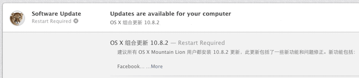 打开苹果电脑上的 Mac App Store 应用,到 “Updates” 一栏就能看到,点击即可自动升级。OS X Mountain Lion 10.8.2 系统最大的两项改进:底层加入 Facebook 分享;语音输入功能加入对普通话和粤语的支持(连按两下 fn 键,然后就说吧)。其它十来项新功能看 Mac App Store 的列表吧。