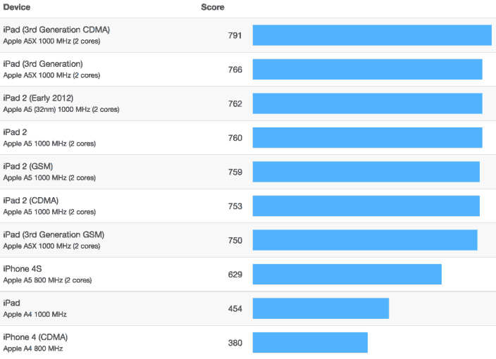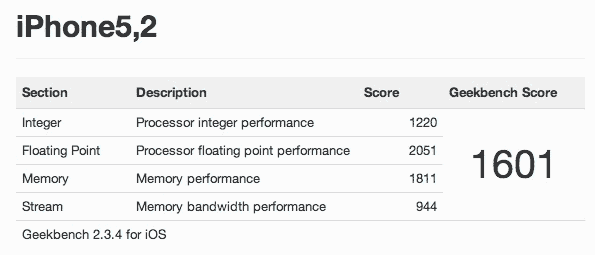 苹果 iPhone 5 的 A6 处理器评测 iPhone讨论区 12/9/20 2.7k 1 苹果在 iPhone 5 发布会上只是说它的 A6 处理器比以前快 2 倍,并没公布具体配置。今天著名的硬件测试软件 Geekbench 官网上公布了苹果 iPhone 5 的测试成绩:1601 分,的确是 iPhone 4S(629 分)的 2 倍半。而且 Apple A6 处理器的配置也确定为双核 1GHz 主频 + 1GB 内存 Phone 4 的 A4 处理器是单核 800 MHz + 512 MB 内存,iPhone 4S 的 A5 处理器是双核 800 MHz + 512 MB 内存。下面是苹果 iPhone 5 A6 处理器的各项具体配置、各款 iOS 设备的 Geekbench 测试得分和几款高端 Android 设备的得分。
