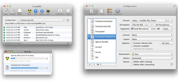 DMG镜像制作工具 DropDMG v3.2 苹果Mac软件 12/12/12 9.1k 16 DropDMG 是一款Mac平台的DMG镜像制作工具,支持拖放操作,要制作DMG,只需将所有的文件准备好,放在文件夹中,然后把文件夹拖放到DropDMG窗口里,稍等片刻就制作成功了。相对于用系统自带的磁盘实用工具(Disk Utilities)来只需哦DMG镜像文件,这个工具能够方便不少。 DropDMG v3.2 下载地址:游客,如果您要查看本帖隐藏内容请回复 工具制作DropDMGDMG镜像