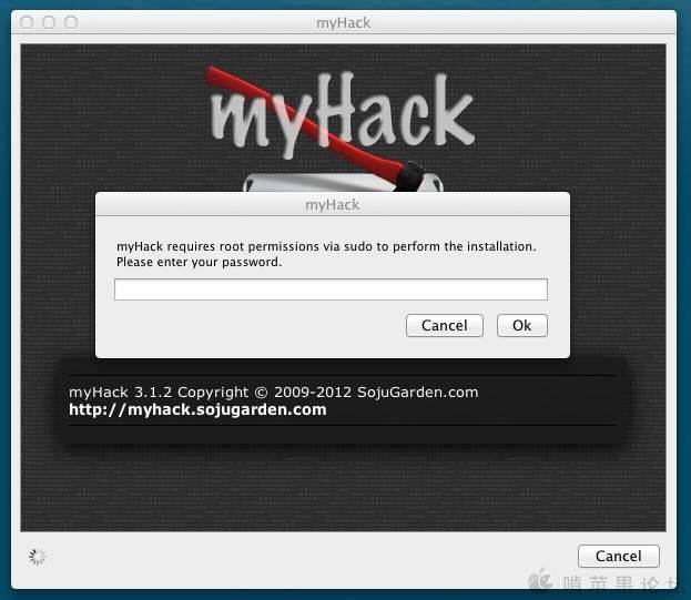 不用安装,直接双击图标就可以打开myHack,打开后会要求输入系统密码,如下图,不明白为什么会必须要输入密码,但不输入密码过不去。