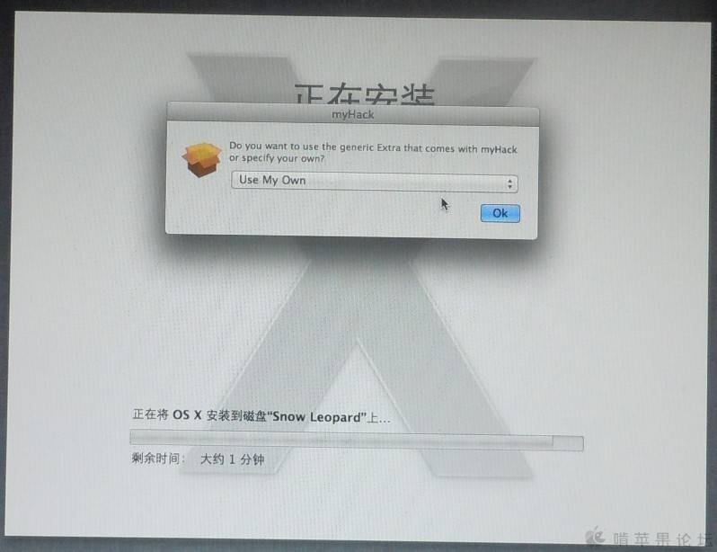 意思是让选择额外的或自已的Extra文件,但我一开始选择“Use My Own ”后,系统可以正常安装成功,但重启后没有了设置界面,直接就将我LION系统中的用户名等设置一并复制过来(我是在我的LION系统下制作的安装U盘),这本来不是什么问题,但在使用中,如果要求输入密码的话,不管输入正确还是错误,都是密码错误的反应,无法验证了,原因实在不明。后来第二次安装时不选择此项,安装后一切正常了,重启后有设置时区、用户名等内容,需要密码验证时也都可以正常验证了。希望大家有能力的研究一下,看看是不是也有同样的问题,谢谢
