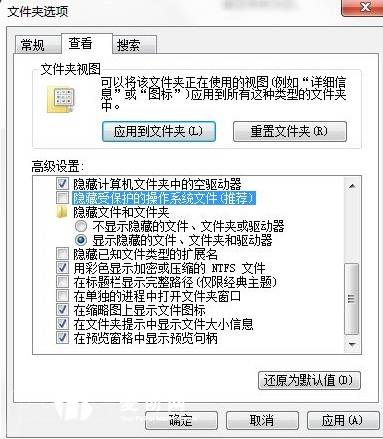 首先我们对windows设置下,因为这些文件都是隐藏文件,我们打开隐藏文件设置。把隐藏受保护的系统系统文件的钩去掉,并把不显示隐藏文件改为显示所有文件,如下图。