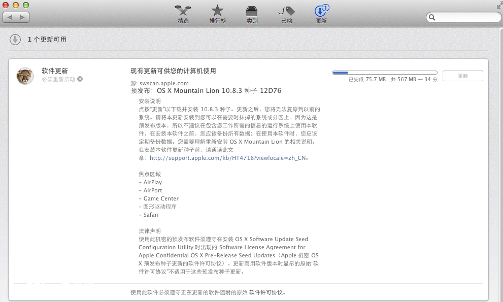 点击更新10.8.3 即可 注意 更新完毕后不要重启,到Mac系统盘_资源库/updates 找到该升级文件