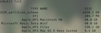 在我的电脑上,EFI分区是在disk0s1的位置,在用雪豹安装盘为硬盘分区的时候,由于选择的是GUID分区表,所以大家在自己的电脑上运行命令后也会看到EFI分区。