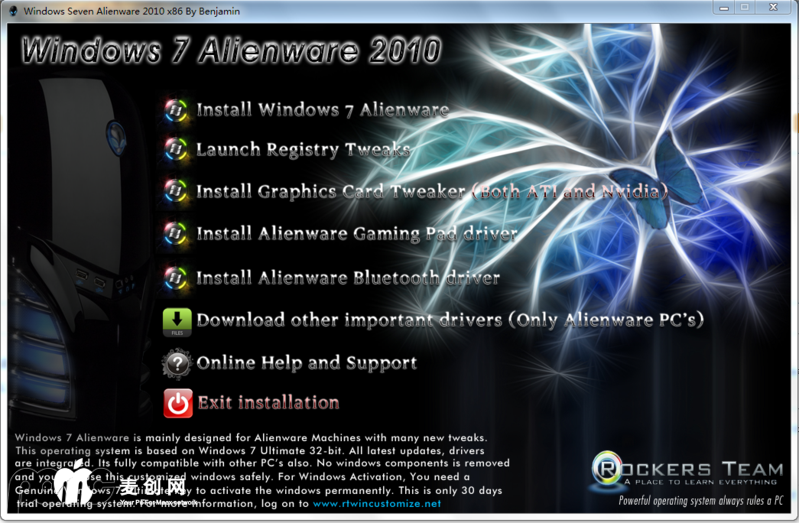 外星人系统Windows 7 alienware 2010 基于windows7 舰旗版改变而来 所以用起来跟WIN7没啥区别 激活方法也跟WIN7一样