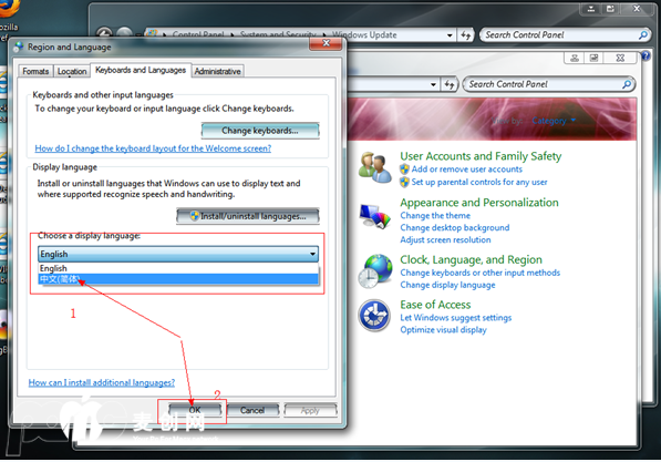 然后在控制面板里面选择箭头标志1的地方change display language(更换显示语言)
