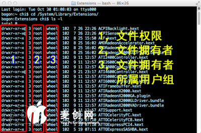 SLE下kext正常权限是复制代码kext的拥有者是root,所属用户组是wheel,root用户对这些文件有读、写、执行权,wheel用户组的用户对这些文件只有读、执行权限