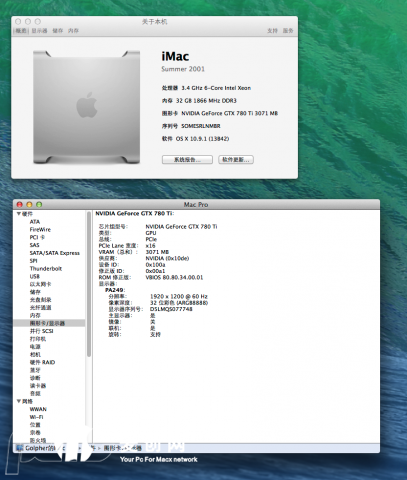 1.22nm的ivb-e处理器(包含新ivb-ep的xeon)在10.9.1 13B42下核心并不支持,在读完kext之后会黑屏,就像几年前刚换ivb一样需要特制核心,还好新的MacBook Pro有了一个特殊的升级版本13B3116的核心提供了22nm新处理器支持,我在二楼将会提供新核心的下载。2.GTX 780Ti并不是像之前我猜测的那样跟GTX780以及Titan用相同的办法就能驱动成功。事实上,780Ti所属的GK110核心有两个版本,一个是GK110A也就是GTX 780以及Titan的核心,他们都是GK110核心通过阉割而来的;完整的GK110其实是GK110B,也就是780Ti的核心,它拥有2880个流处理器,Apple在10.9.1中直接提供的NV驱动并不能正确驱动GK110B,所以Quadro K6000以及GTX 780Ti都不能正常工作。几天前NV突然蹦出一个给Mavericks(10.8.5亦可用)的专用Web驱动331xxxxx,这驱动中修复了GK110全系列的OpenCL的错误,顺便补充了对GK110B的核心支持(NV真良心)。