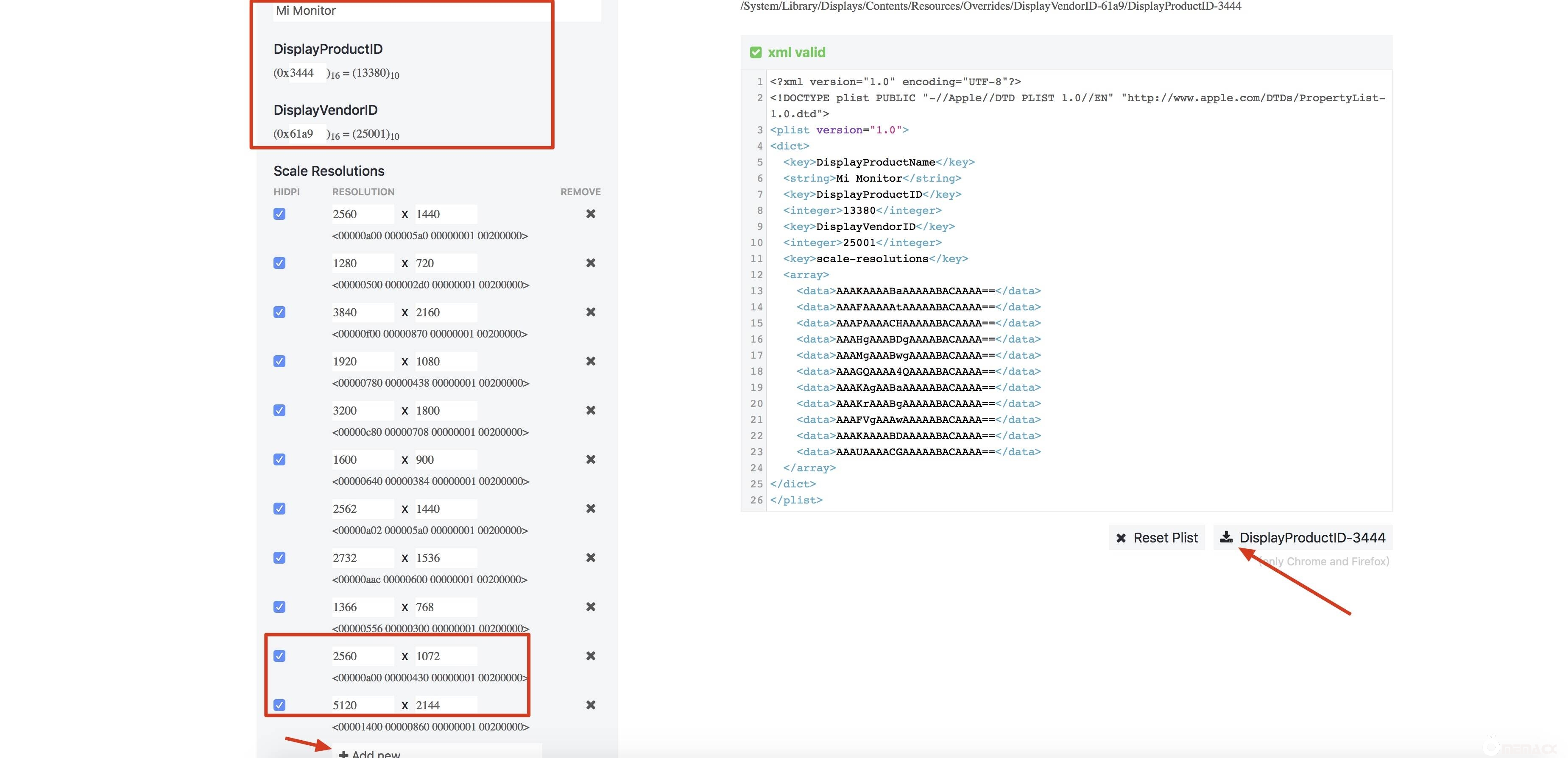 因为小米显示的分辨率是3440X1440,21:9 经过论证,开启HiDPI将分辨率设置成2560X1072 最为合适,并添加5120X2144分辨率支持:添加小米显示器型号,两个获取的16位进制ID号。