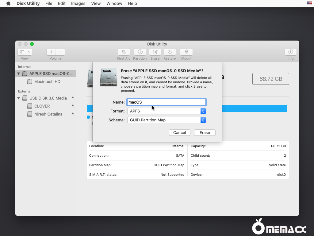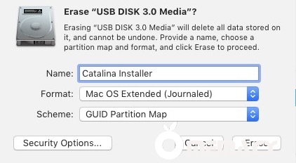 将USB擦除为“ Mac OS扩展(日志)格式”和“ GUID分区图”方案。