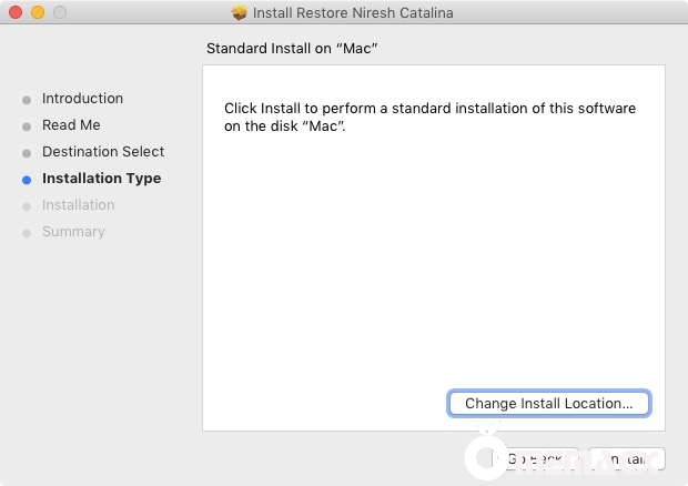 注意: “Restore Niresh Catalina.pkg”非常容易出错。如果在第一次运行该应用程序时找不到“更改安装位置”按钮,请重新启动计算机并重新运行该应用程序。