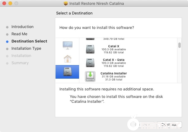 双击“Restore Niresh Catalina.pkg”以启动应用程序。默认情况下,该应用程序将针对您计算机的U盘驱动器。