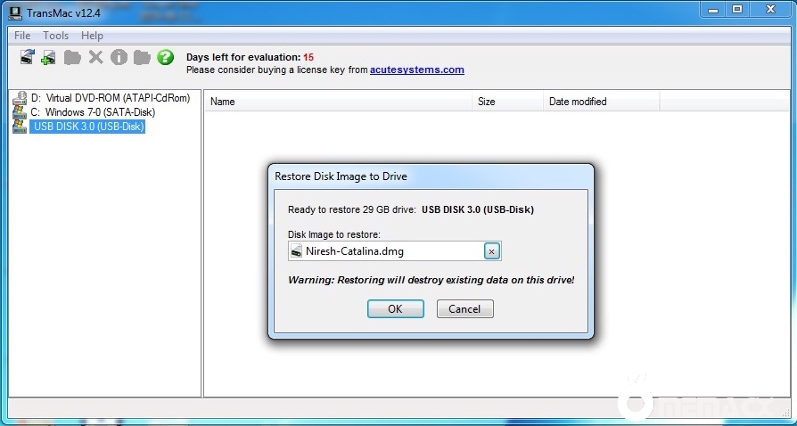 在Windows中,请使用TransMac软件将DMG映像恢复到USB驱动器/闪存驱动器。