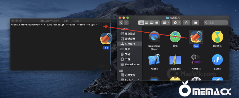 复制代码 然后再次执行如下指令即可:- codesign --force --deep --sign - /文件位置(直接将应用拖进去即可)