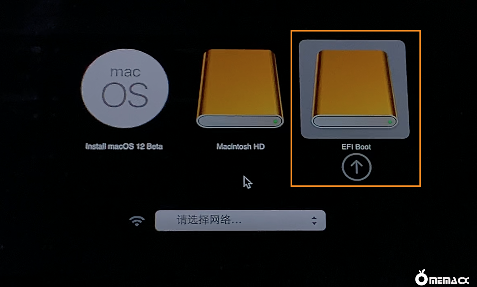 关闭终端,把音量调大,插着U盘重启电脑。开机时听到“嘟”长声(启动声)的同时,按住option键不松,屏幕会出现几个启动选项。选择黄色的“EFI Boot”图标。然后电脑会自动关机。