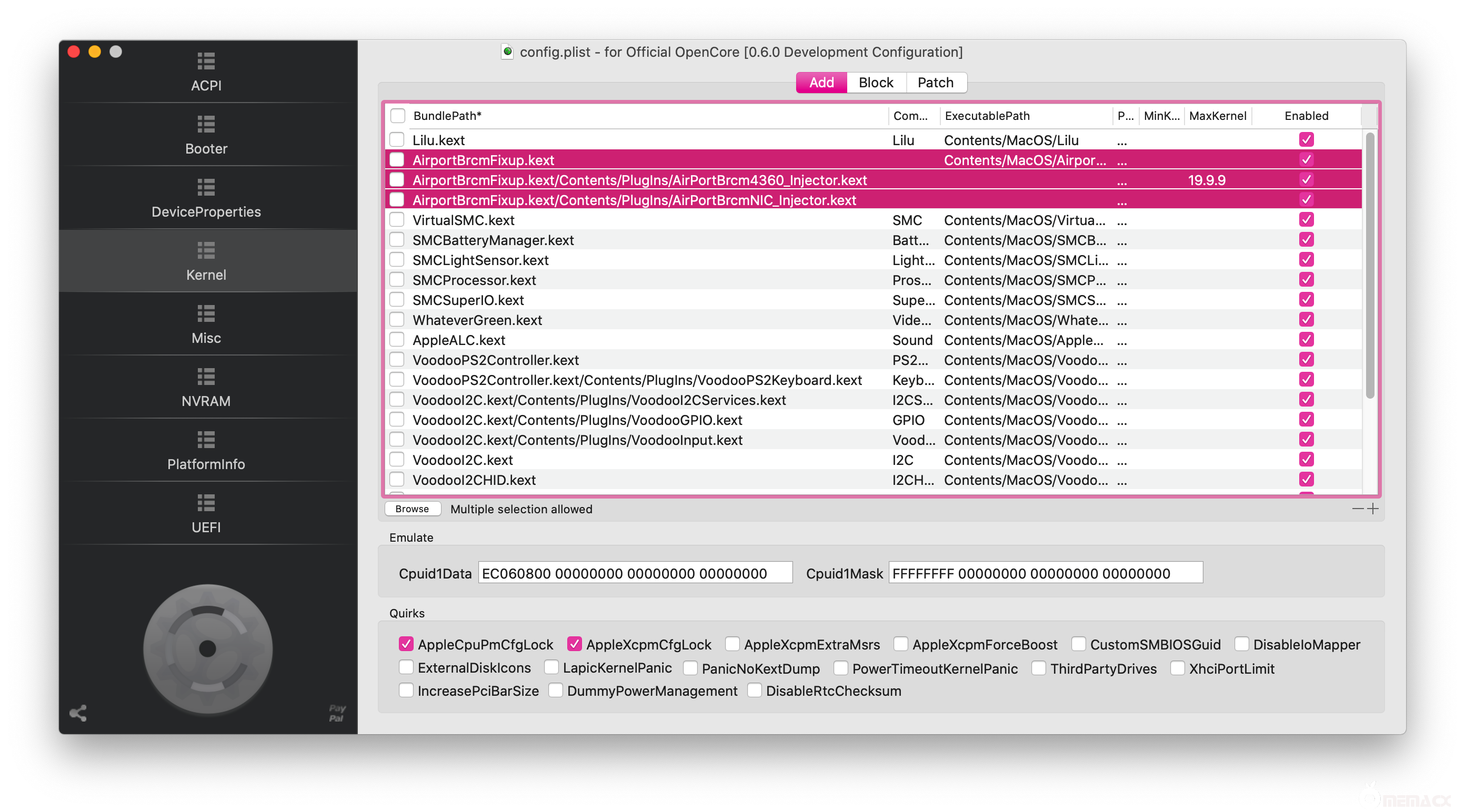 - Kernel->Add->Browse,将/EFI/OC/Kexts目录下的BrcmBluetoothInjector.kext / BrcmFirmwareData.kext / BrcmPatchRAM3.kext添加进列表中,注意加载的顺序