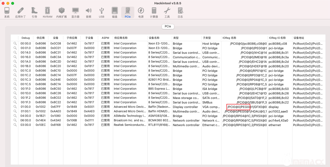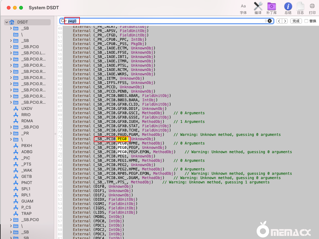4.接着在dsdt中搜索显卡的名字peg0,查看显卡的路径