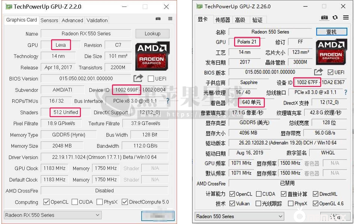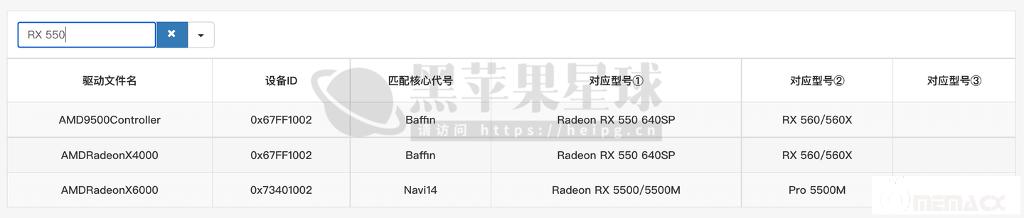 接着用 RX550 举例,苹果内置的驱动仅包括 Baffin 和 Polaris 核心 RX550 640SP 版的设备 ID:0x67FF1002,但同时 AMD 还用 Lexa 核心推出了 RX 550 512SP 的 0x699F1002 版本。由于设备 ID 和 macOS 内置的 ID 对不上号,导致无法驱动。