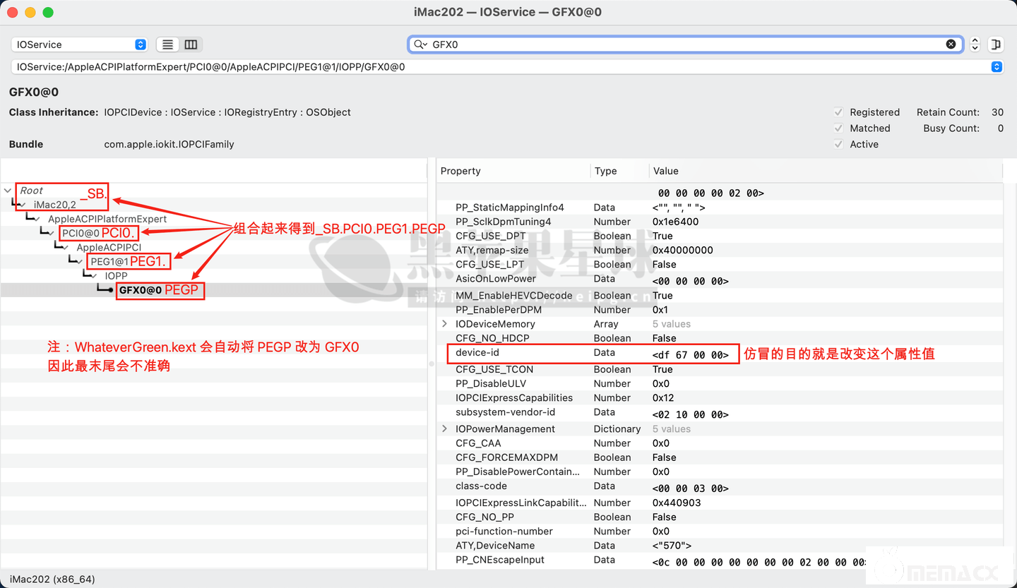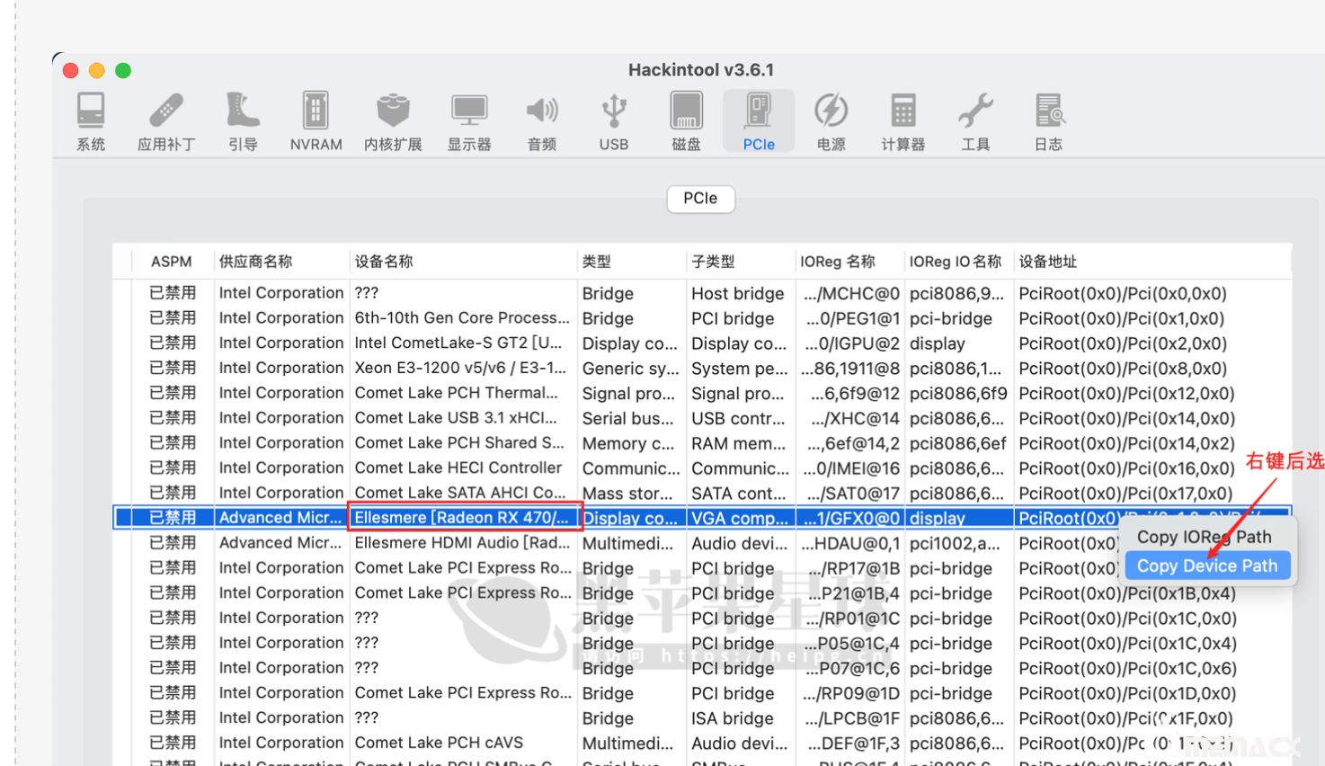 通常,我们使用 IORegistryExplorer.app 在 macOS 中来完成查找操作,但这个软件只支持 10.14 及以上的系统,所以使用 10.13.6 的同学只能使用 Windows 方法或自行转换 PCI 路径