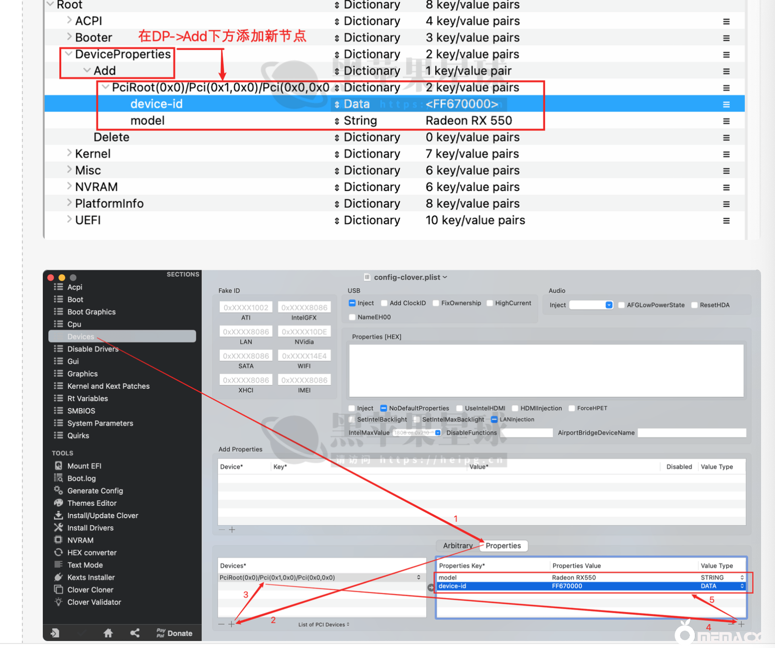 确定了设备 ID,下一步就是如何注入。方法一是通过 OpenCore/Clover 的注入设备属性(DeviceProperties)功能来仿冒,通过向指定的 PCI 路径为设备注入一些属性,达到仿冒设备 ID 以获得驱动的效果。下面是 RX550 512SP 仿冒 RX550 640SP 的例子:
