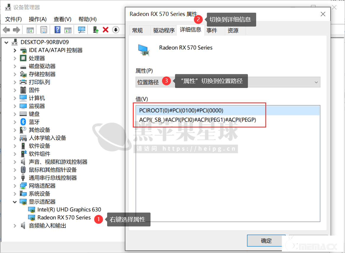 进入 Windows 10,按下 Win + X 组合键,在弹出的菜单中打开“设备管理器”。找到你的独显,右键选择“属性”,然后切换到“详细信息”选项卡,在属性框中找到“位置路径”,如下图: