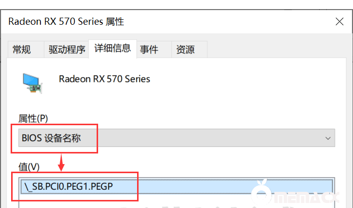 这个部分就是我们需要的设备路径。另外,如果能直接在“属性”中找到“BIOS 设备名称”就更好了:
