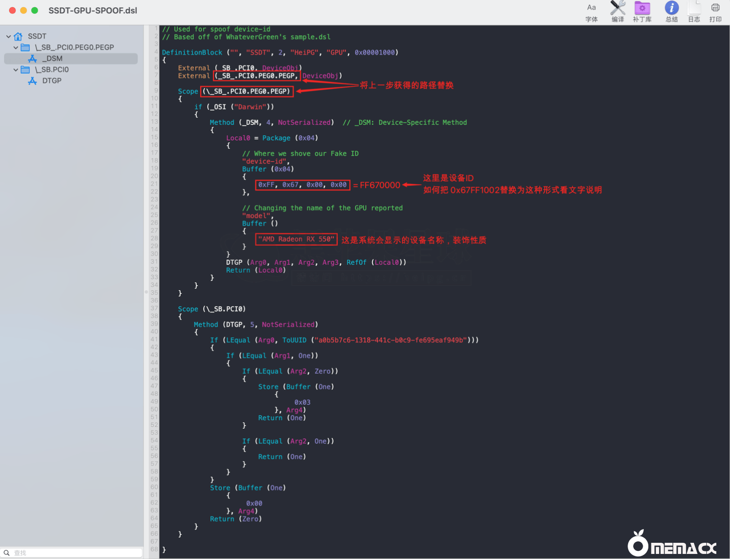 5.修改预编译的 SSDT接下来需要使用 MaciASL.app ,这是一款用来编译 dsl 和 aml 文件的编译工具。使用软件打开黑苹果星球整理好的 .dsl 文件(注意看文件包说明选择文件)