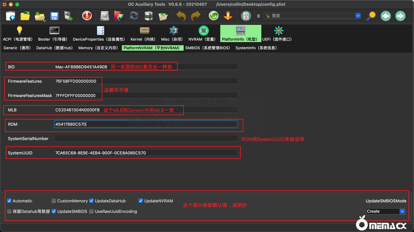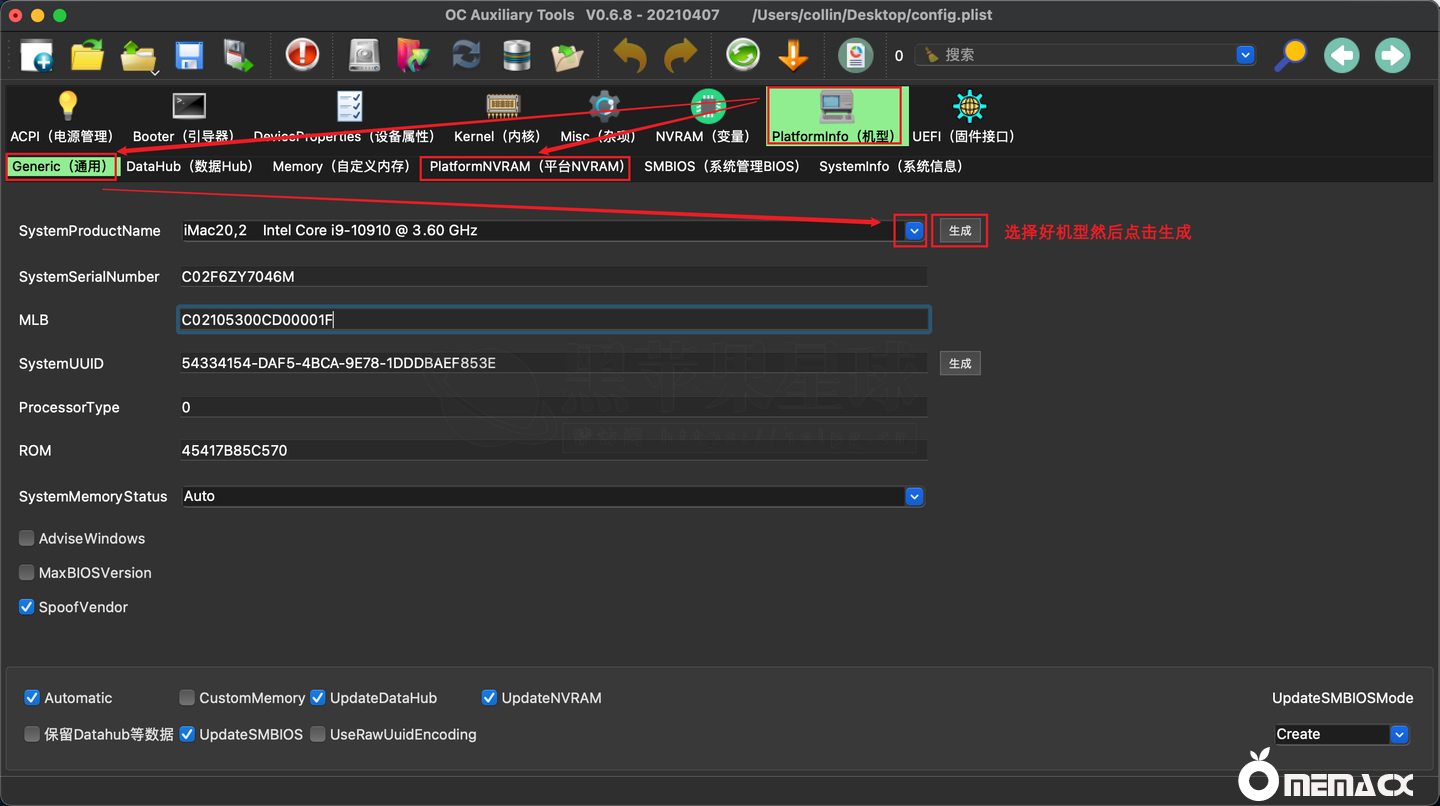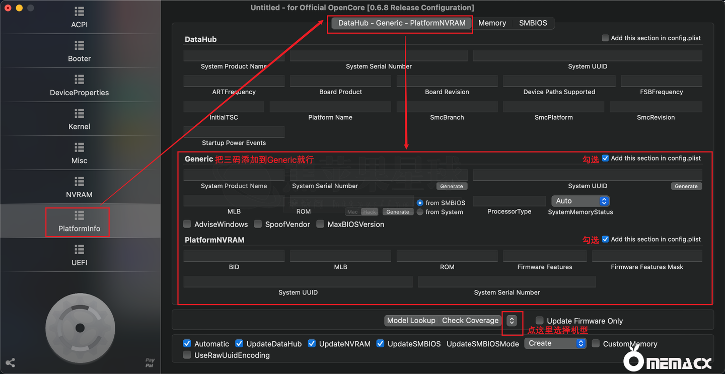 - 需要勾选 add this section in config.plist 的部分是 Generic 和 PlatformNVRAM,其它部分可留空;