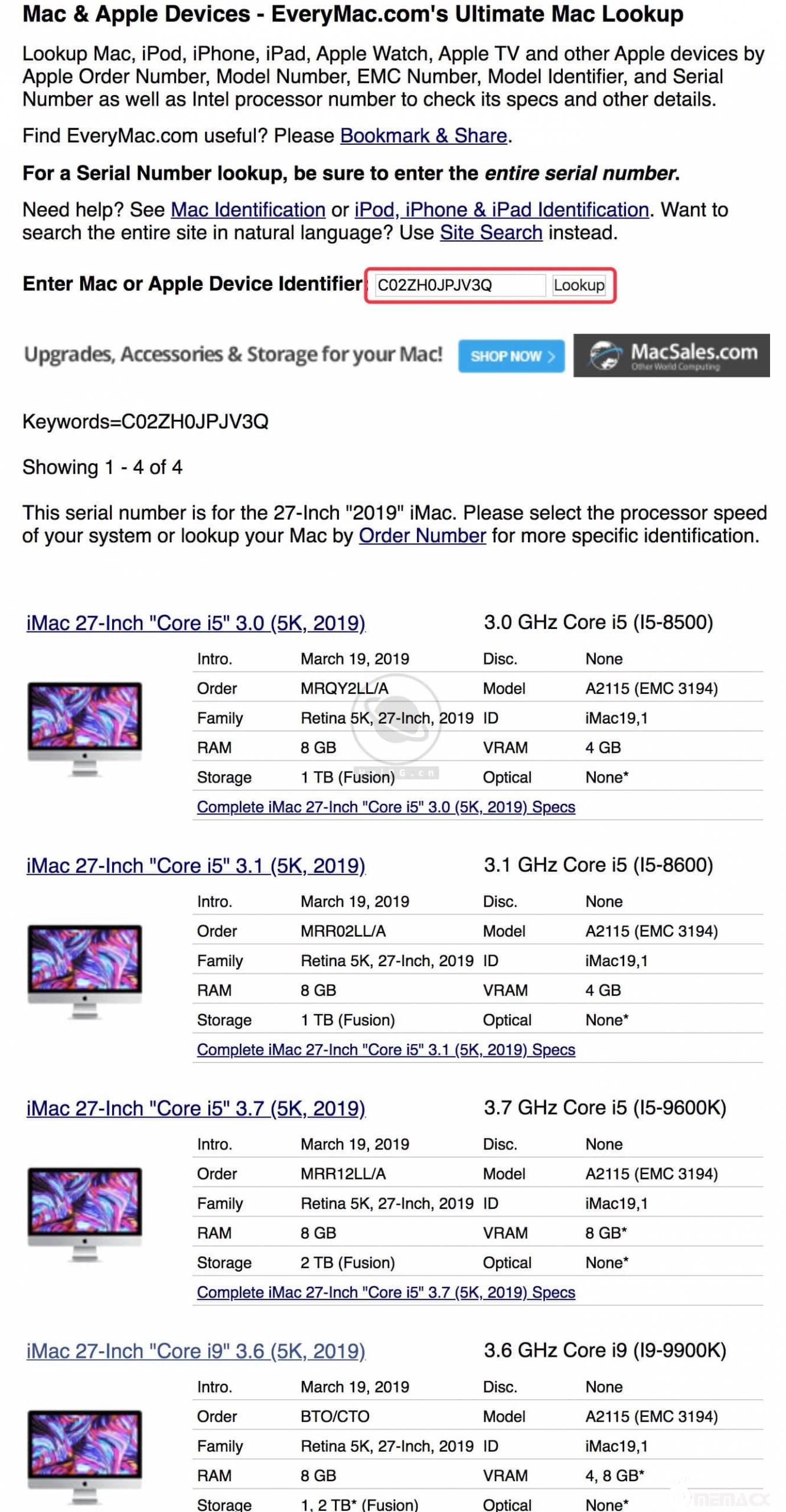 上图中, EveryMac 显示出 iMac19,1 的验证结果,说明编码结果是正确的,如果没有返回结果,可以多试几次生成。99% 的情况下,生成的序列号一般都会符合编码规则。
