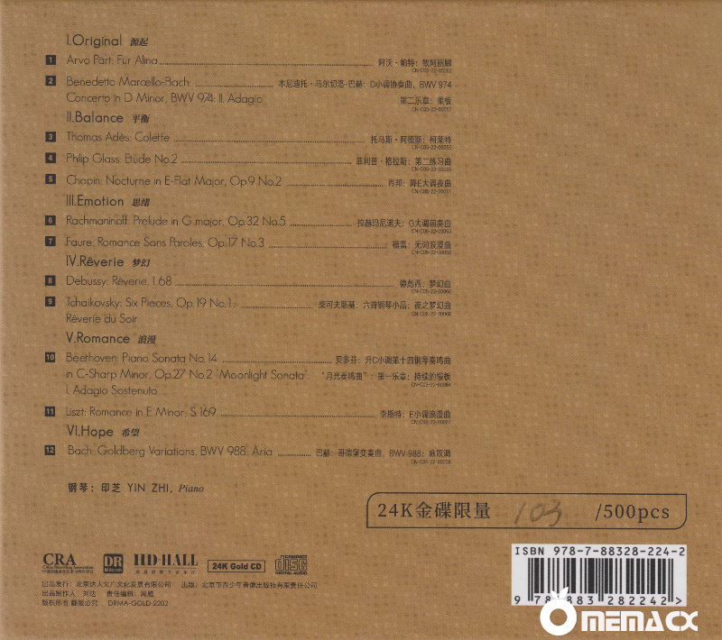 达人艺典《秘境·印芝钢琴独奏辑》头版限量编号24K金碟 HD-HALL