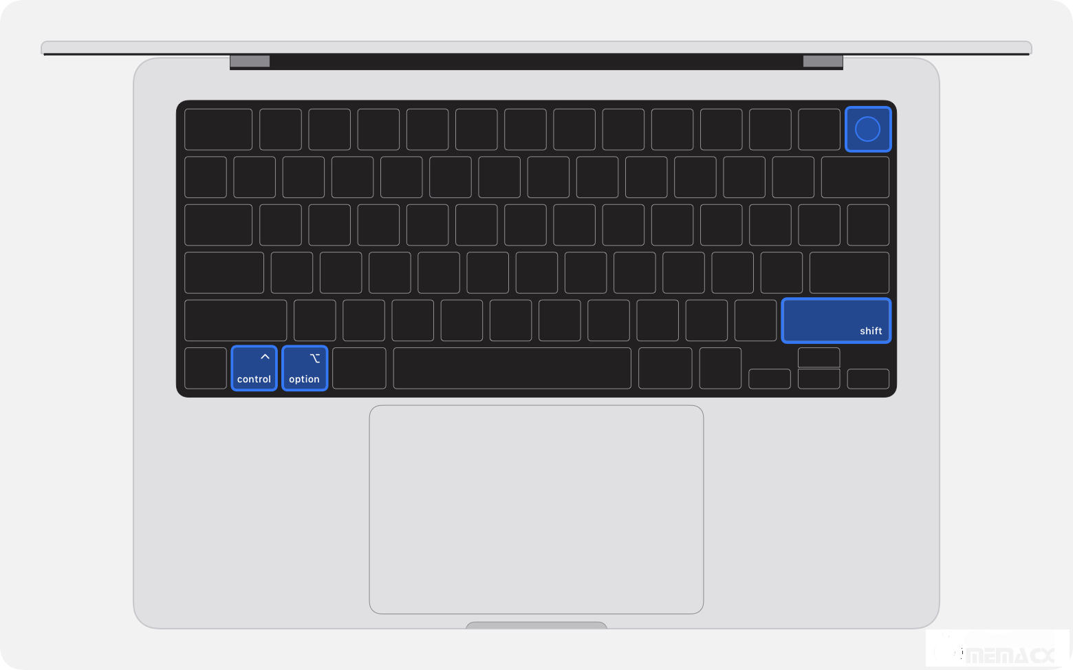 d. 搭载 T2 芯片的 Mac 笔记本电脑:按住所有这四个按键约 3 秒钟。当另一台 Mac 在 “访达” 或 Apple Configurator 中显示 DFU 窗口时,请松开所有按键。如果那台 Mac 先显示一条提醒,询问你是不是允许配件进行连接,请松开所有按键并点按 “允许”。目标 Mac 现在会进入 DFU 模式,并且应该会显示空白屏幕。